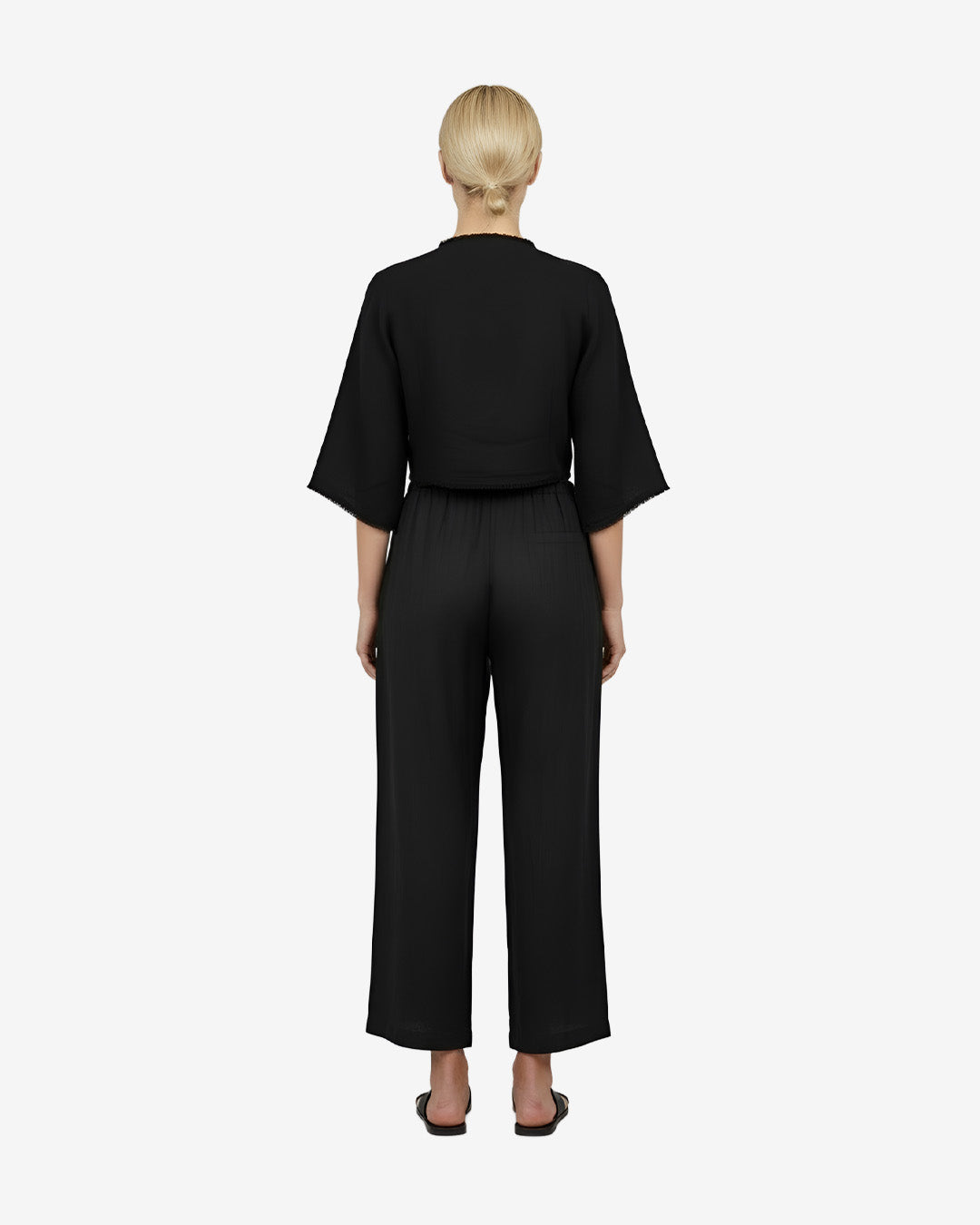 The Coco Pants feature a wide-leg fit with a soft elastic waistband and side pockets. Sits low on the hips with a relaxed cut.
