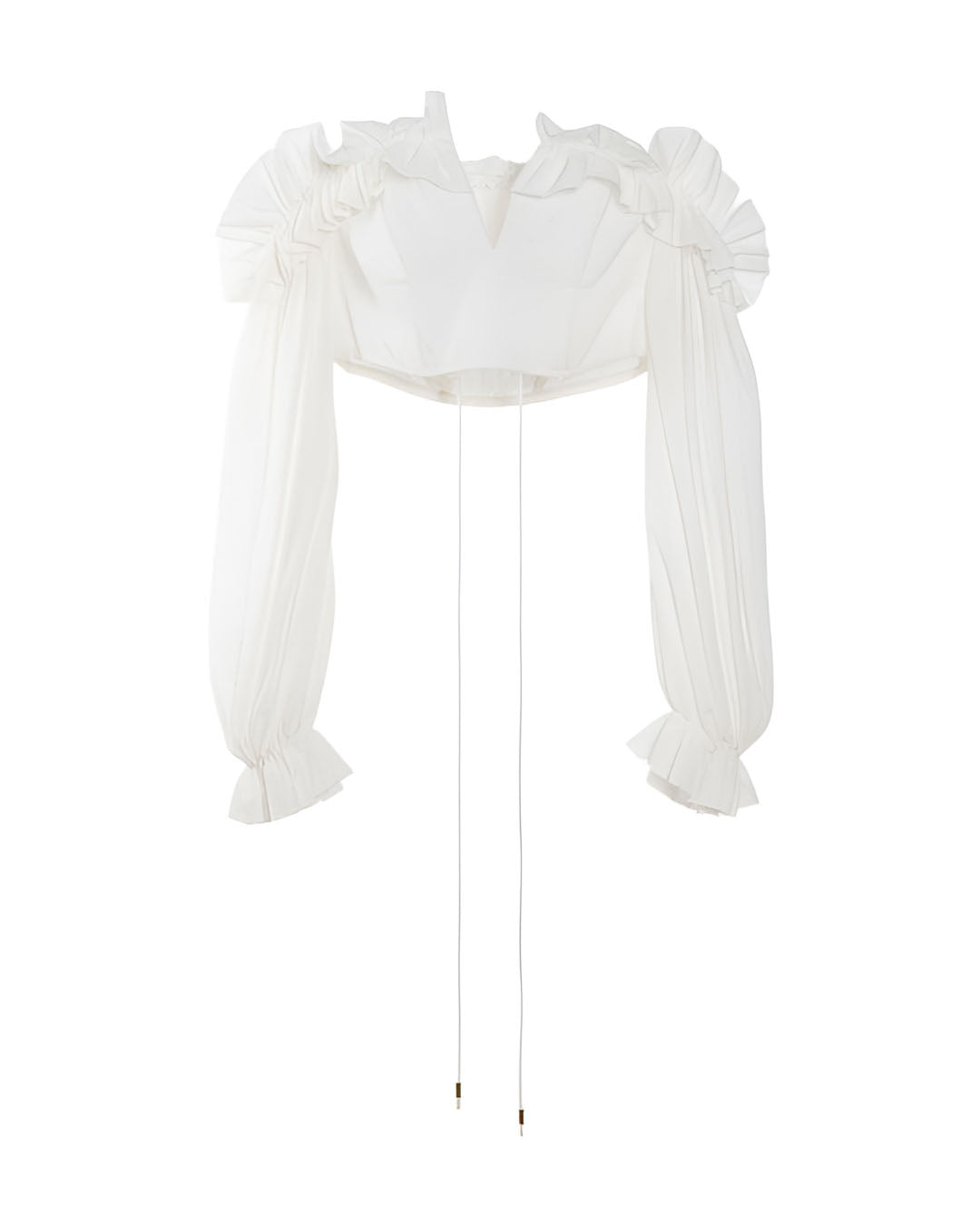Handcrafted cotton corset with delicate ruffle details, exuding femininity and grace. Made from 100% cotton for a soft and breathable feel. Elasticated off-shoulder design with voluminous sleeves for a romantic silhouette.