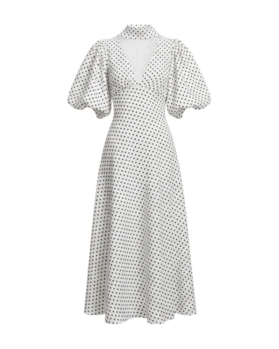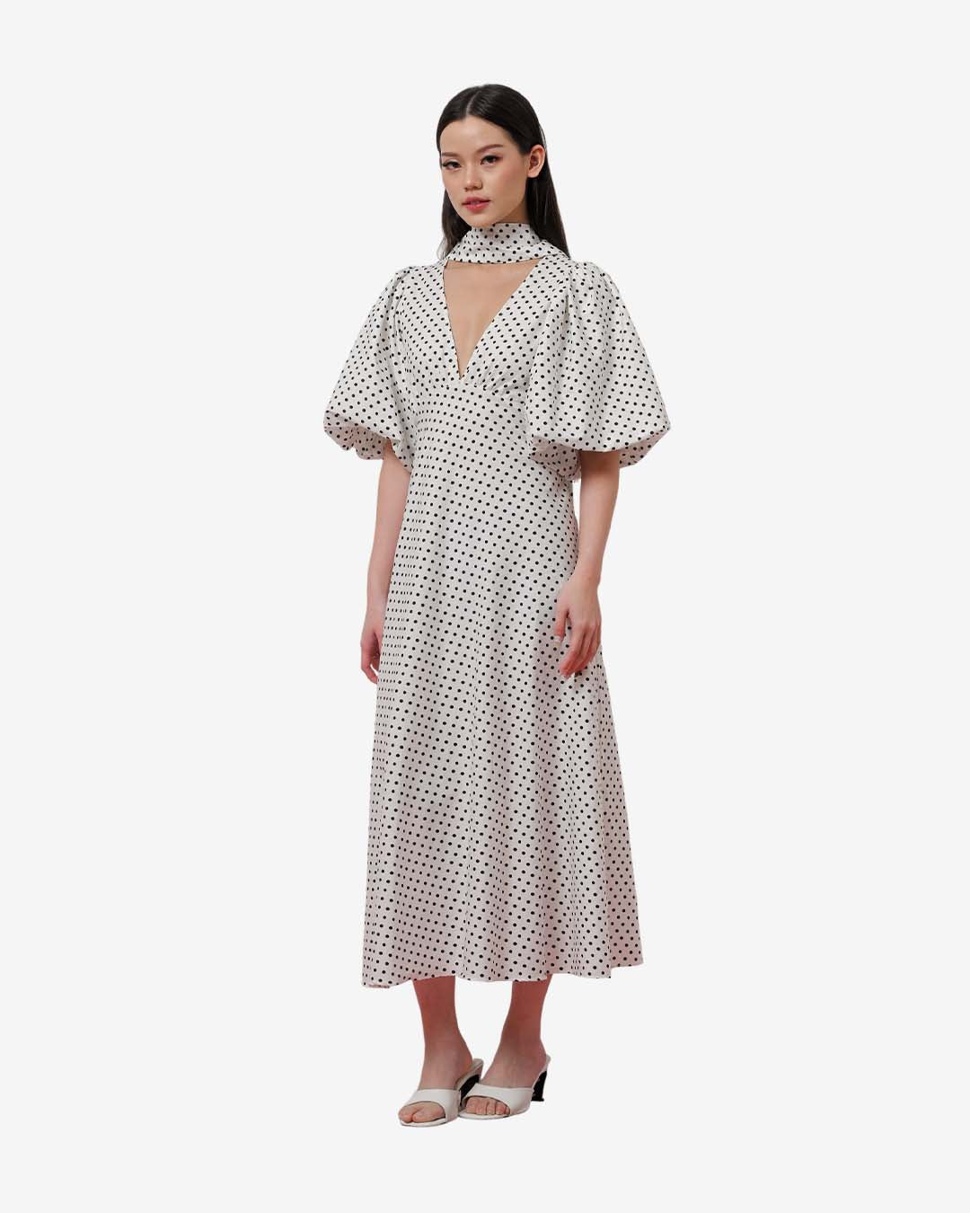 The Dottie Dress features a chic polka-dot pattern, an alluring V-neckline, a soft shawl detail, and a beautiful fluid drape. Finished with puffy balloon sleeves. Fabric is 100% Japanese cotton