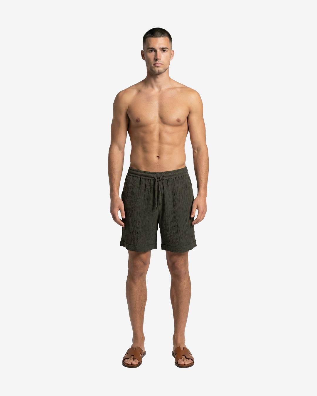 The Apollon Short in khaki is crafted from breathable textured rayon linen fabric for all-day comfort. Designed with a relaxed medium length fit, it features an elastic waistband with adjustable tie, folded hem detailing, and functional side and back pockets, making it a versatile wardrobe essential for casual and weekend wear in men’s shorts bali.