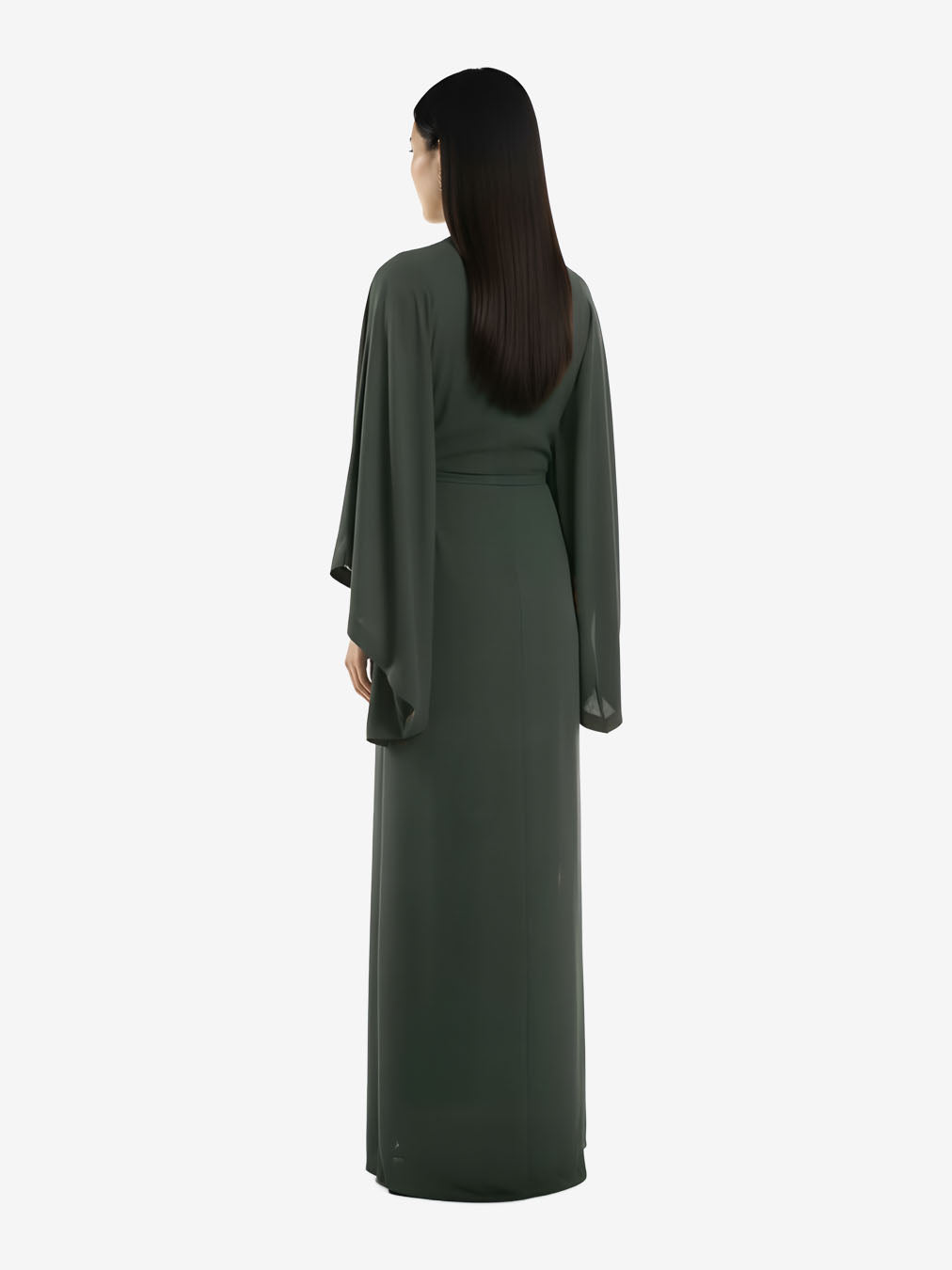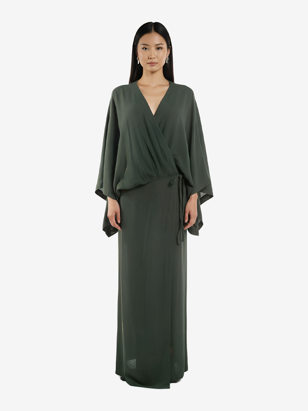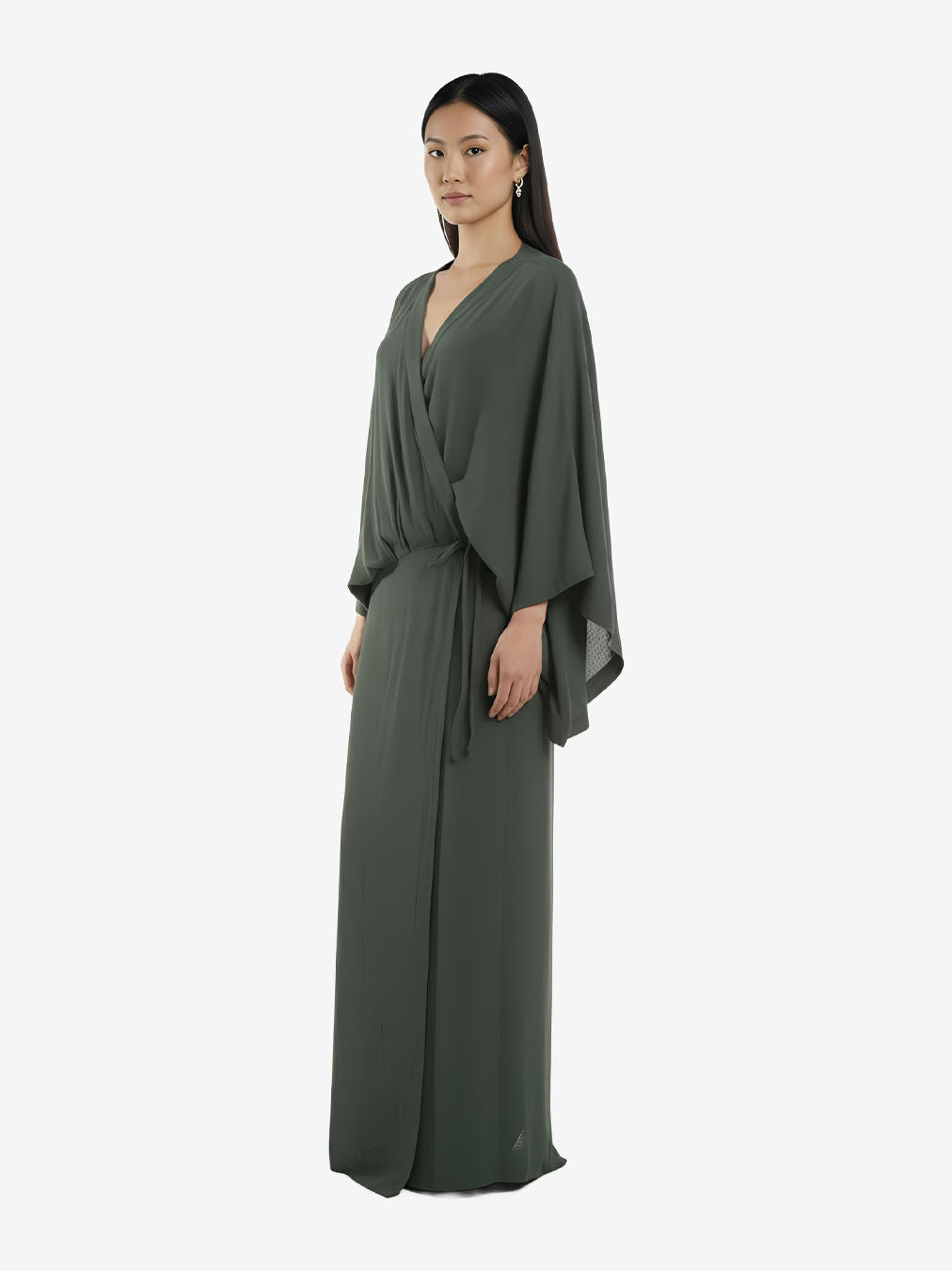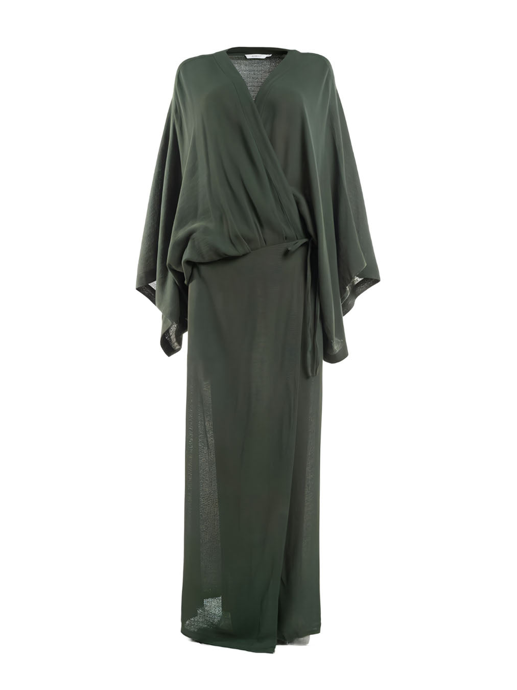 Kimono-inspired wrap dress with wide sleeves and adjustable tie closure. The design allows dual styling: worn closed as a dress or open as a lightweight coat. Clean-finished seams ensure comfort and durability. Suitable for casual or evening wear. Relaxed wrap fit, adjustable waist.