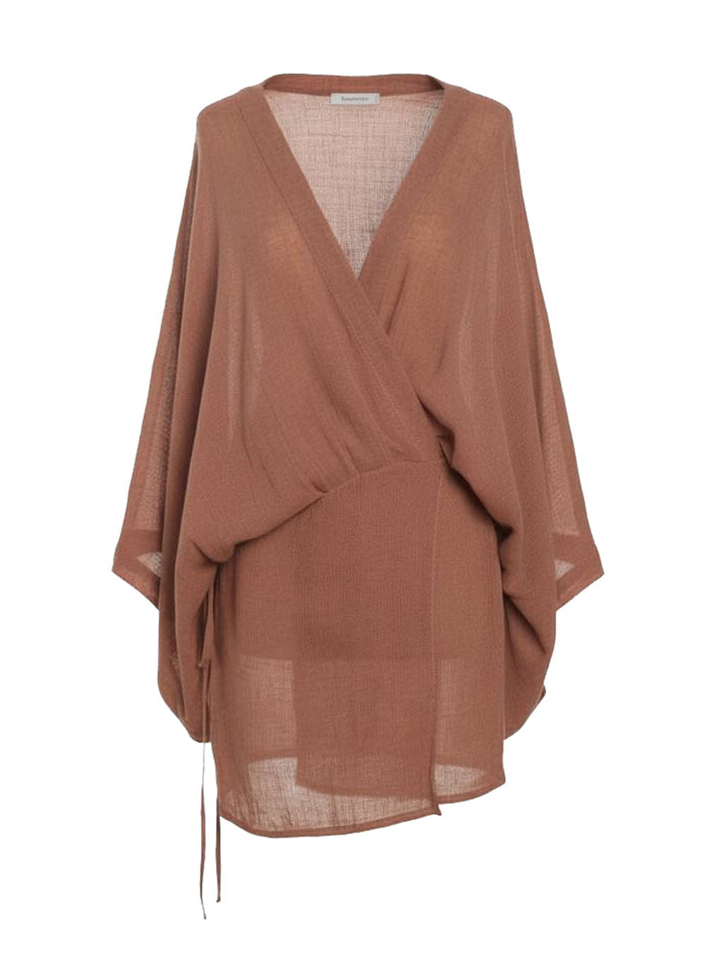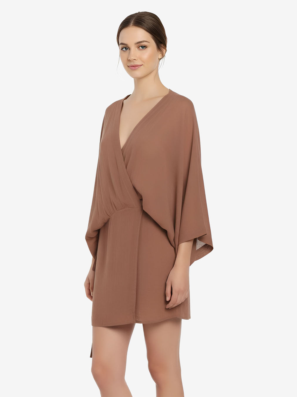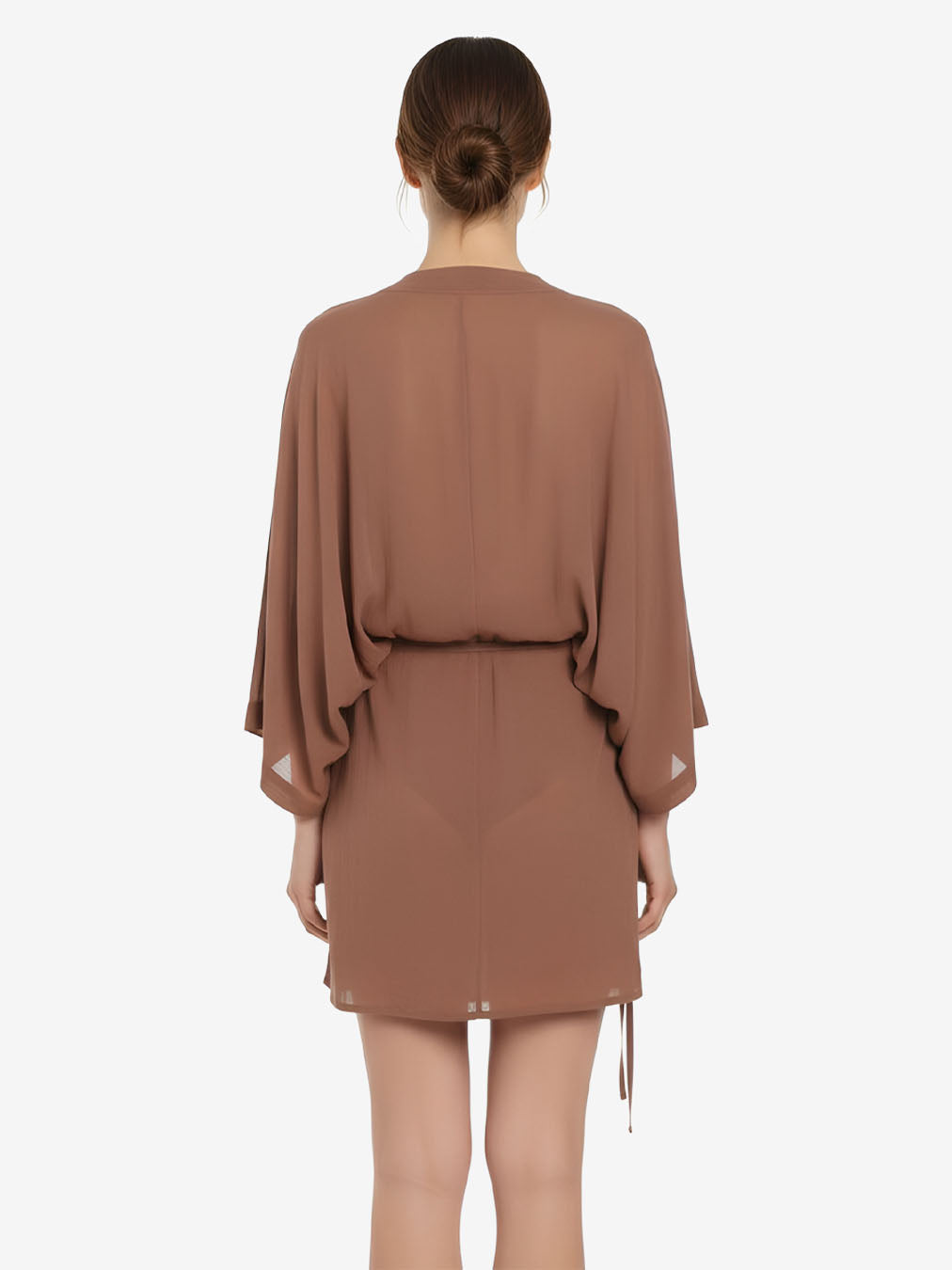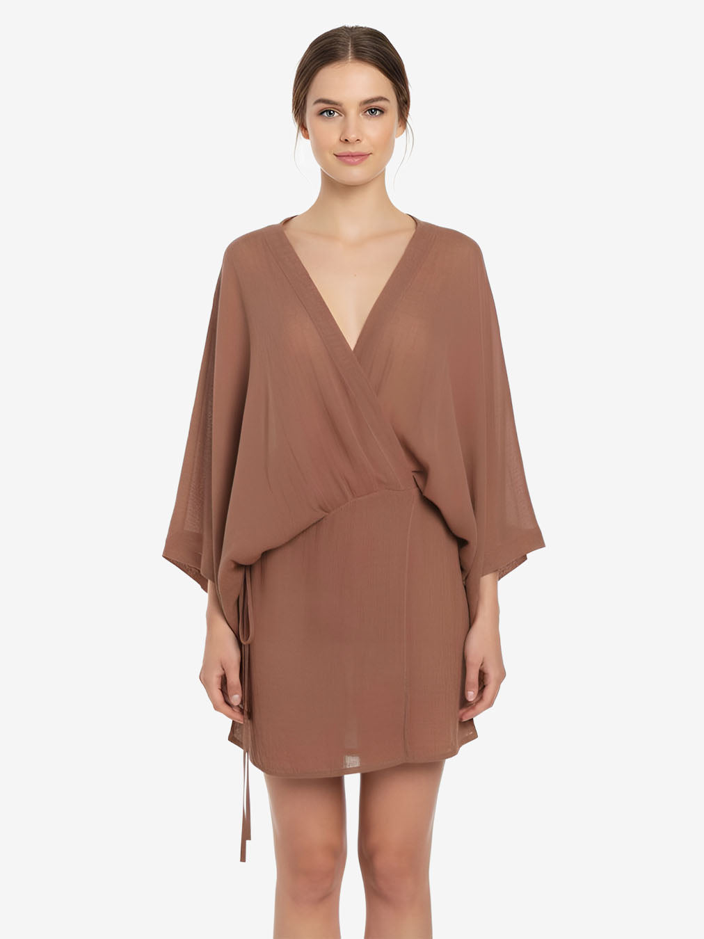 Short kimono wrap dress featuring wide sleeves and a self-fabric tie closure. Designed with a versatile wrap construction that allows it to be worn closed as a mini dress or open as a lightweight vest. Playful and elegant - the kimono wrap mini dress is made to move effortlessly from day to night.