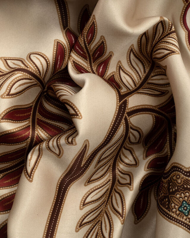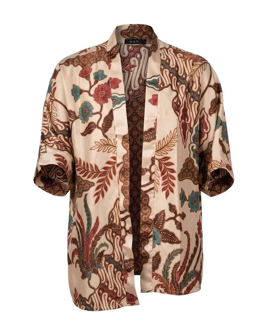 Capri Unisex Kimono Shirt come in a beautiful and fresh print in ruby red, royal green and brown over sleek beige tone, creating a contrasting and classy look. It is handmade with love in Bali by a local artisan family in clean production process, fair trade and environmentally and ethically conscious manner.