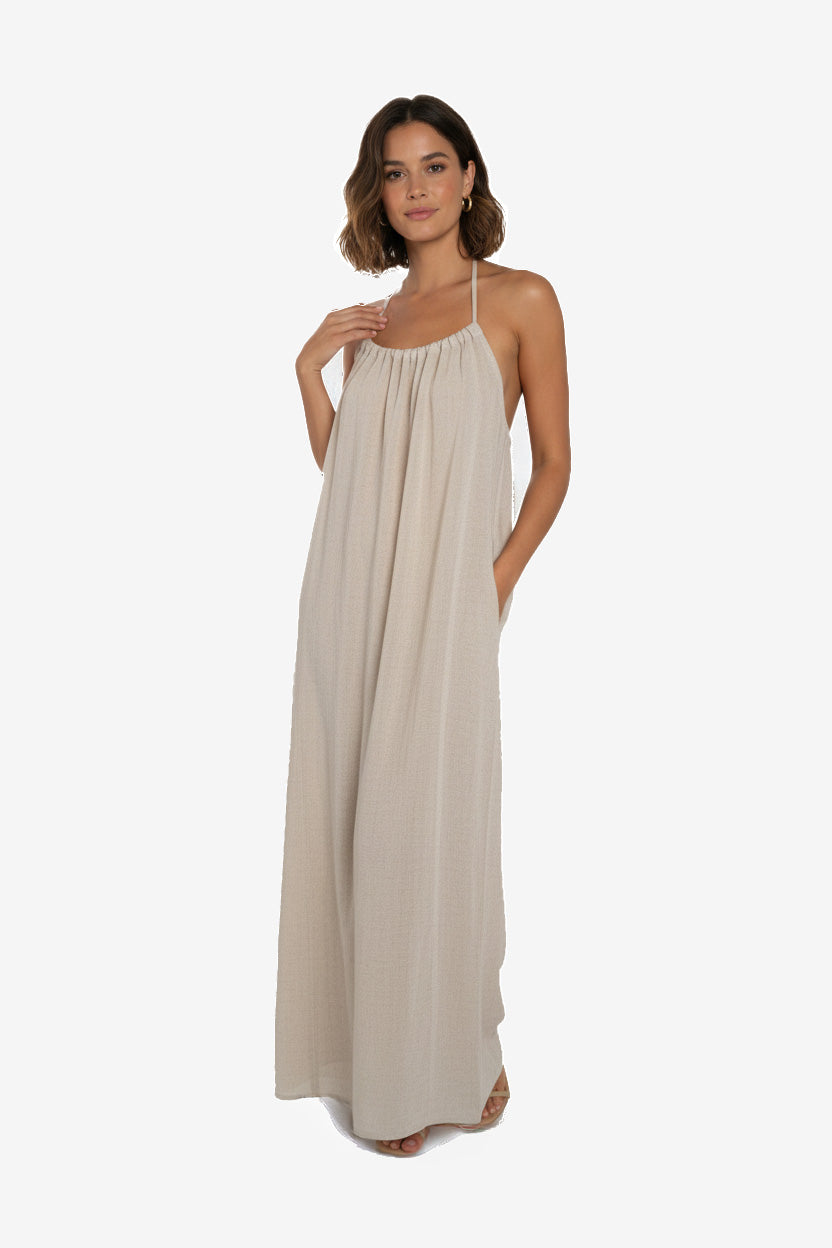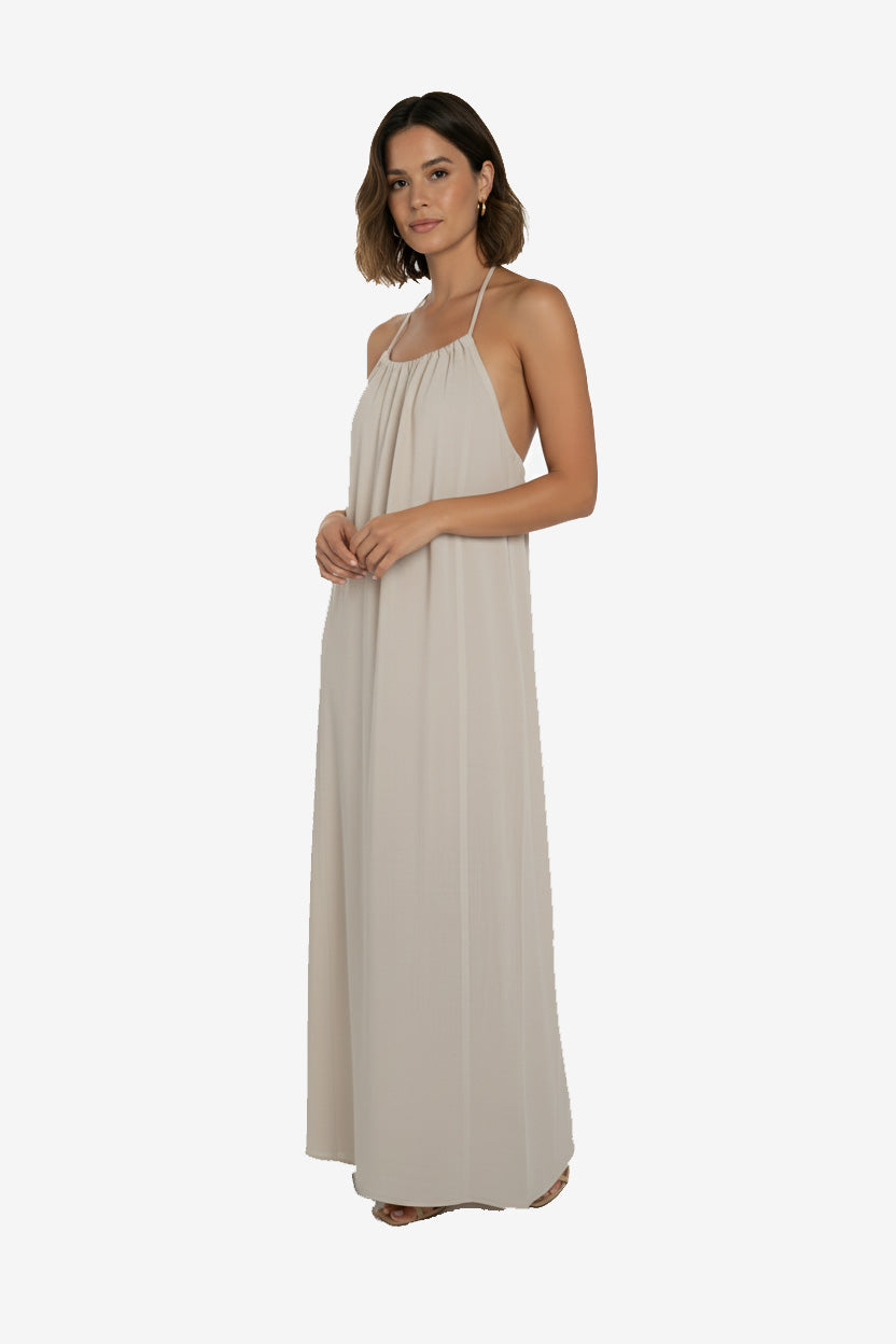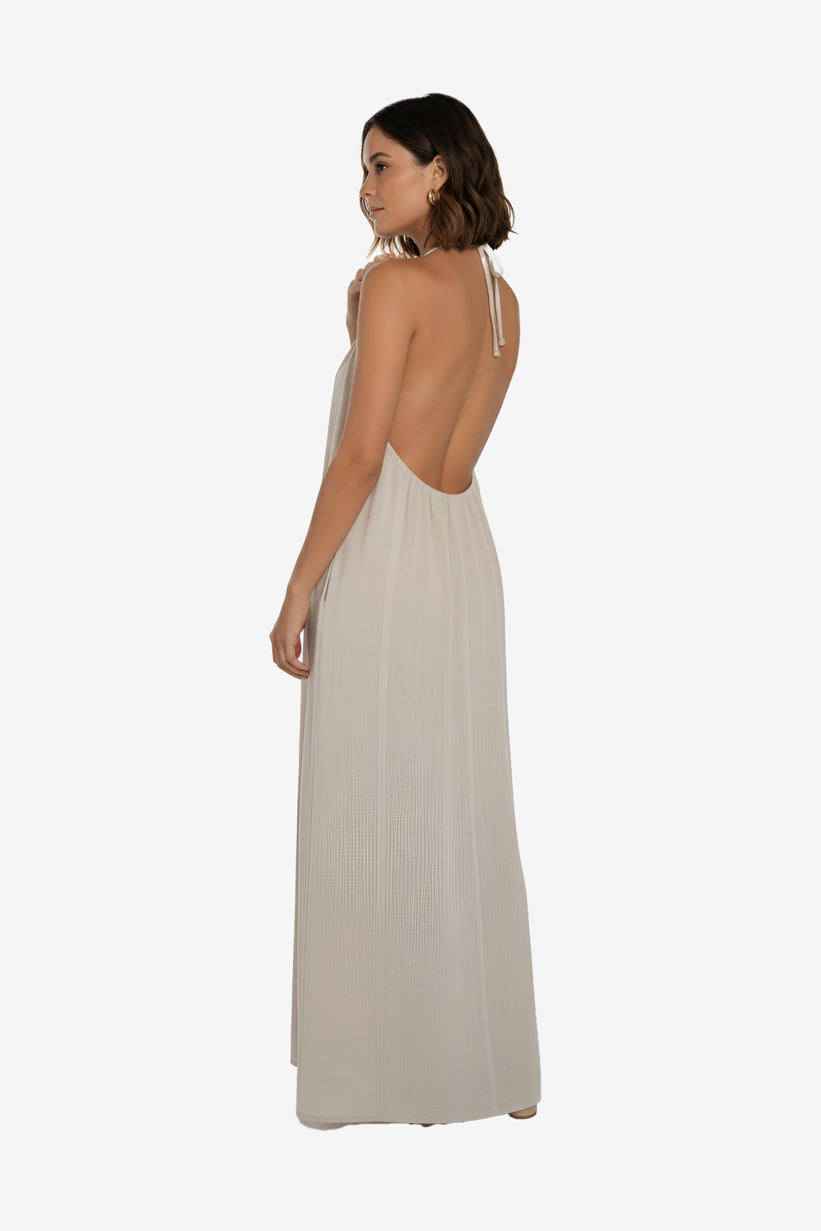 Maxi dress with open back design. Tie closure at the neck and adjustable back ties to cinch and customize the fit. This backless maxi dress captures the essence of summer freedom with its flowing lines and sensual open back. This piece embodies refined simplicity- timeless, feminine and irresistibly chic.