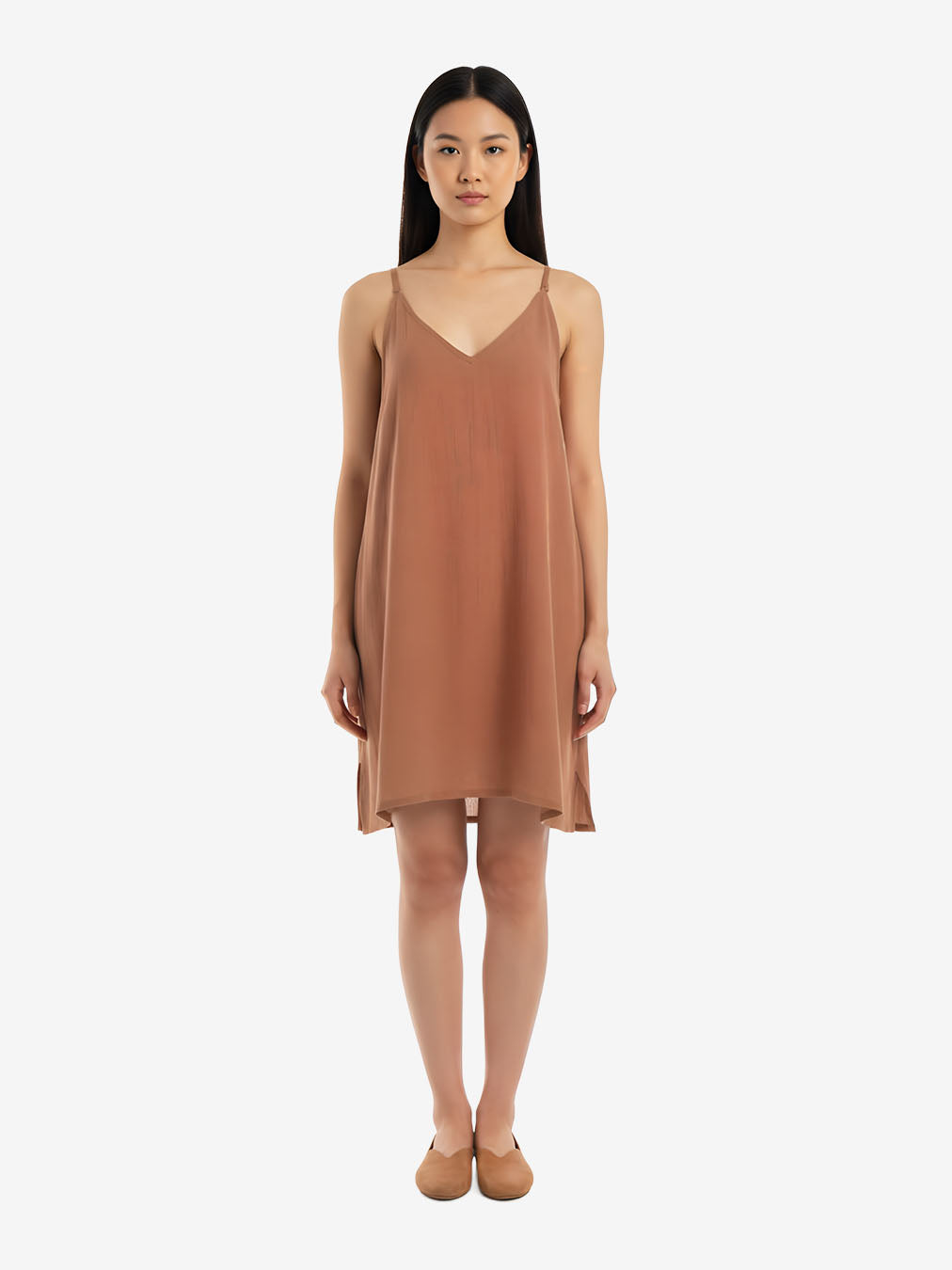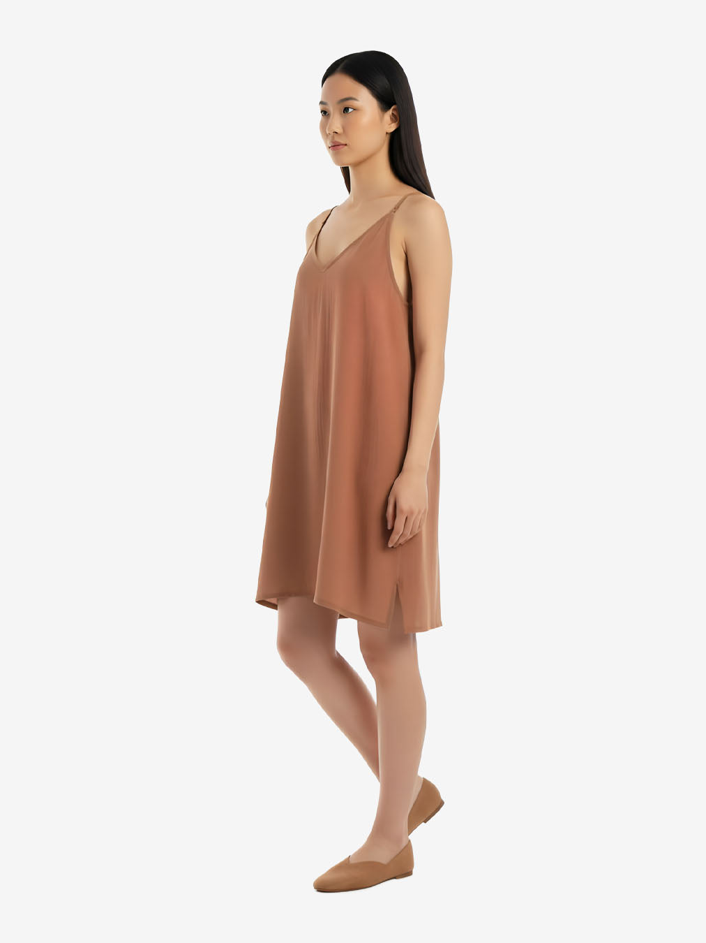 Mini dress with adjustable shoulder straps. Deep V-neckline at the front and plunging V at the backside slits on both sides for ease and movement. Crafted in lightweight, breathable linen fabric with a soft drape. Playful and effortlessly feminine, this mini dress is made for sunny days and warm nights. Featuring adjustable straps and deep V neckline both front and back, its flatters the silhouette with an elegant yet relaxed charm. Perfect for barefoot walks on the beach or styled up for a summer night out. A versatile piece that capture the spirit of freedom and effortless chic.