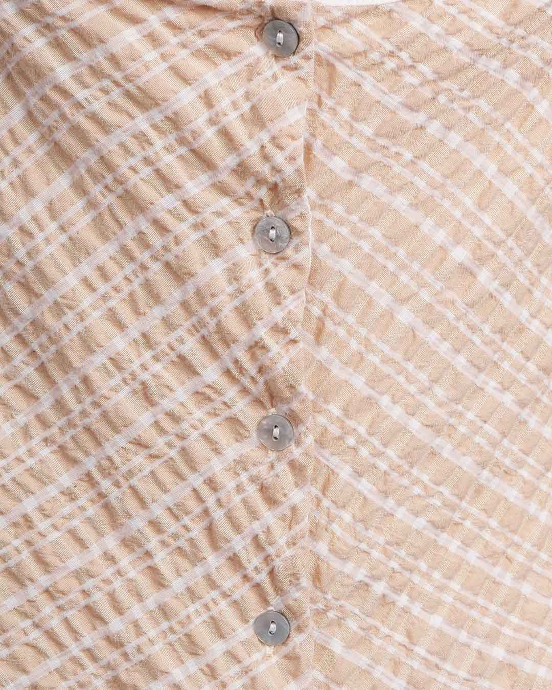 Add some classic flair to your wardrobe with the Cinta Top. This cute bias cut top is made n rayon with a seersucker effect in this Bisque Check print features a soft rayon voile lining for ultimate comfort and breathability. The back closure boasts beautiful shell buttons, adding a touch of elegance to the effortless, straight-fitted design. Feel fabulous and fashionable when you pair this top with the matching Ruby Pants.