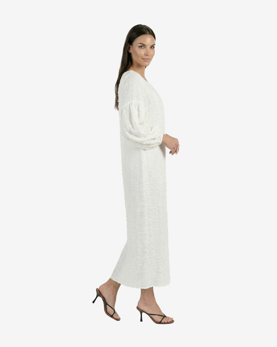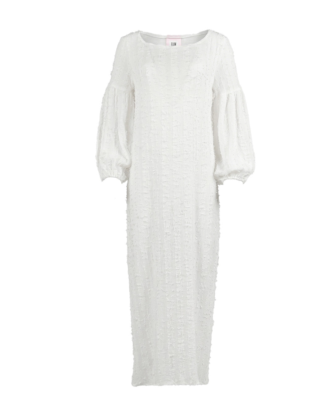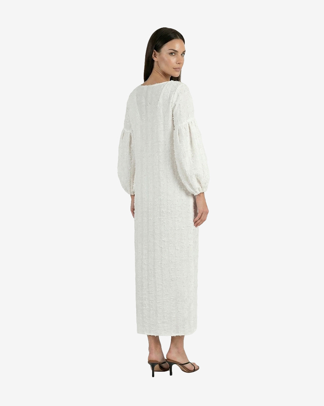 A romantic, flowing maxi dress crafted from a lightweight textured fabric with subtle vertical detailing. Designed with soft voluminous sleeves and a relaxed silhouette, it drapes effortlessly over the body for an airy, ethereal feel. Finished with a delicate scarf detail at the neckline, it’s a timeless piece perfect for slow summer days, special moments, and barefoot evenings in nature.