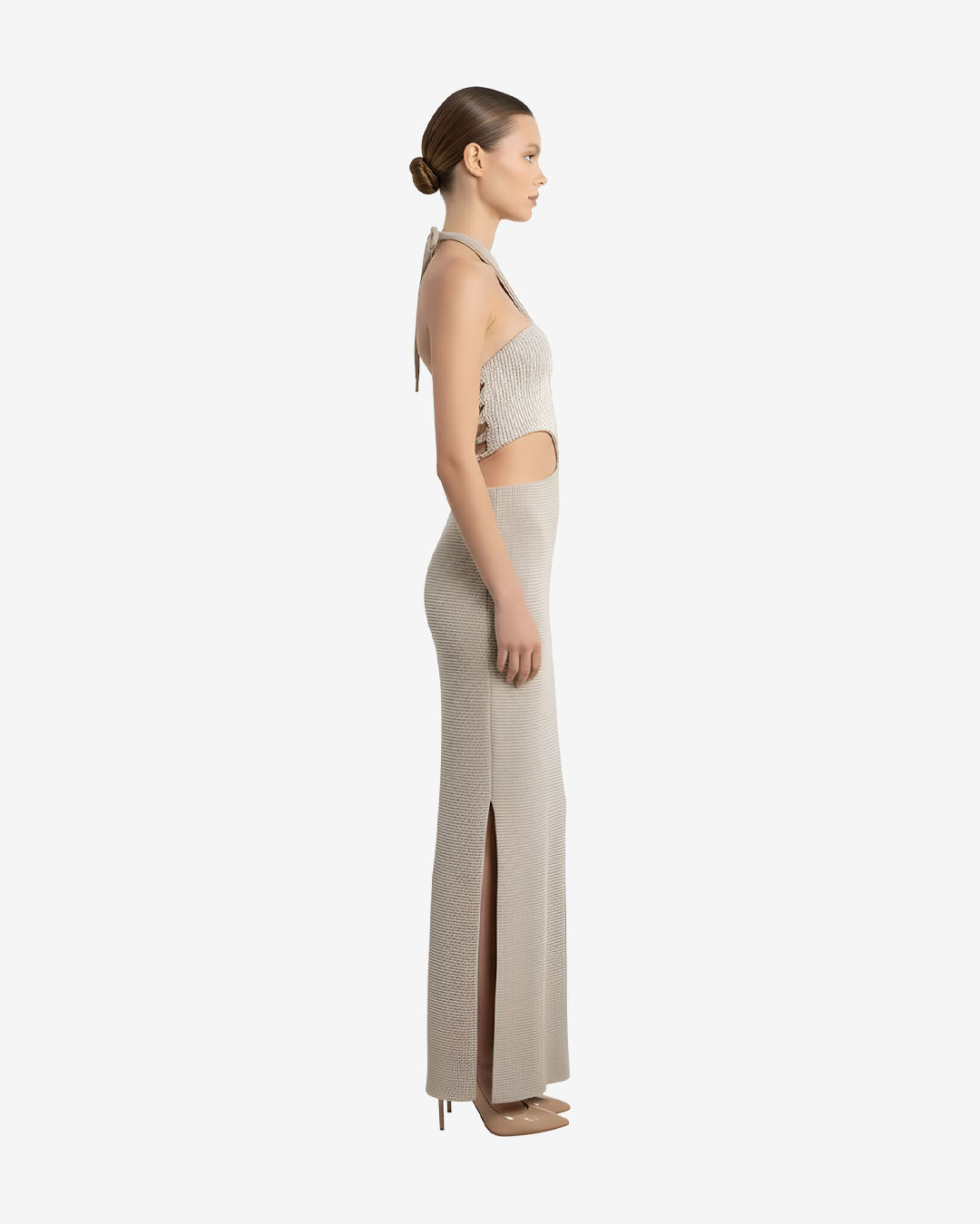A striking and contemporary silhouette featuring chic cut-out accents that make a bold statement. The halter tie-back neckline allows for adjustable height and comfort, while the open back with adjustable straps ensures a flawless fit. Completed with an invisible back zipper for a sleek finish and a mini skirt lining for smooth coverage and effortless elegance.
