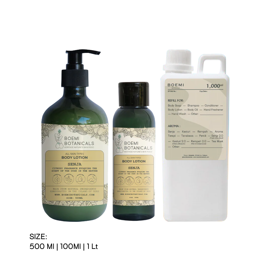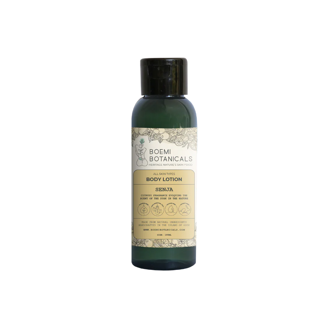 A nourishing everyday ritual. Crafted with love on the Island of the Gods, BOEMI Botanicals Fresh & Citrusy Body Lotion “Senja” delivers soft hydration through a blend of Soya Oil, Shea Butter, and Aloe Vera Extract. It helps maintain the skin’s moisture and leaves it feeling gently nourished. For dry skin, you may enhance your routine by adding a few drops of Rosehip Oil. Infused with 100% pure essential oils, the "senja" variant carries a fresh citrusy aroma inspired by the calm of dusk in nature.