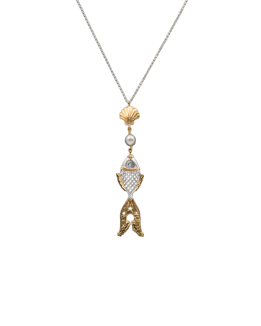 This special Madre Kunst necklace has a precious stone pearl connecting the clam and fish pendants, forming an extraordinarily intricate piece of jewelry. The pearl is an organic jewel brought into the world by a pearl.