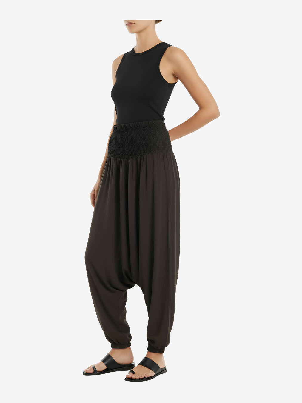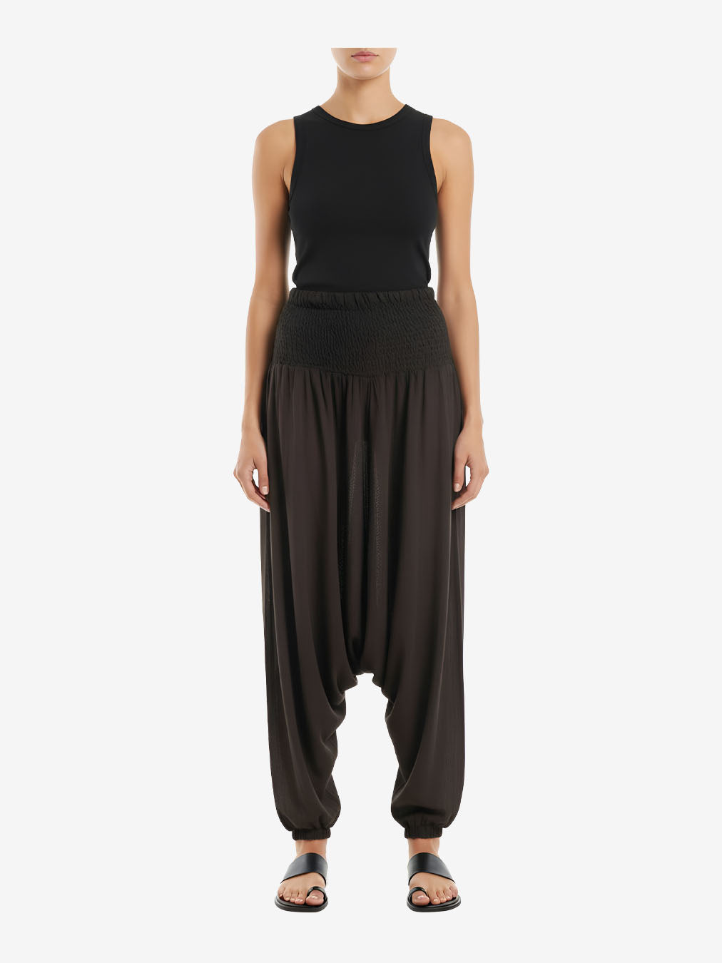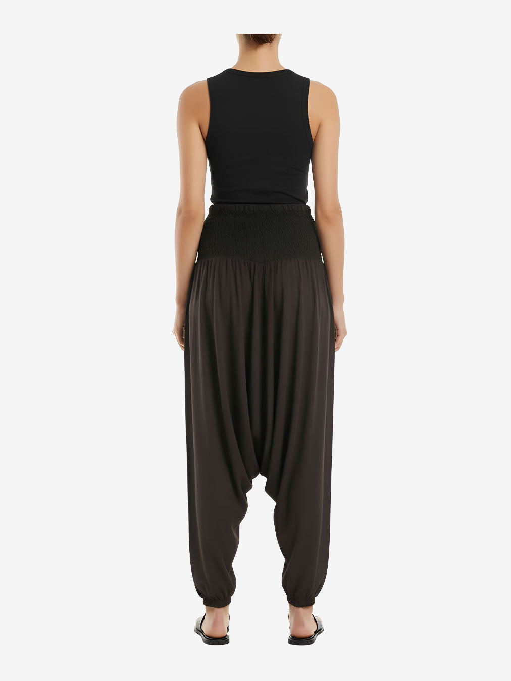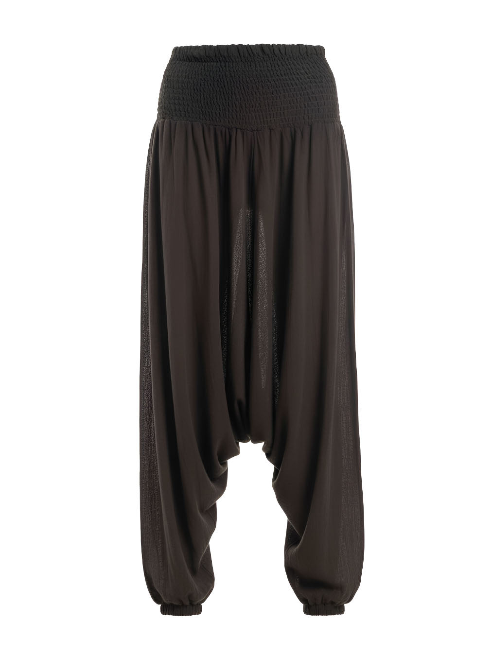 Loose-fit sarouel pants with a dropped crotch and tapered legs. The waistband is fully elasticed for comfort and flexibility, suitable for multiple sizes.