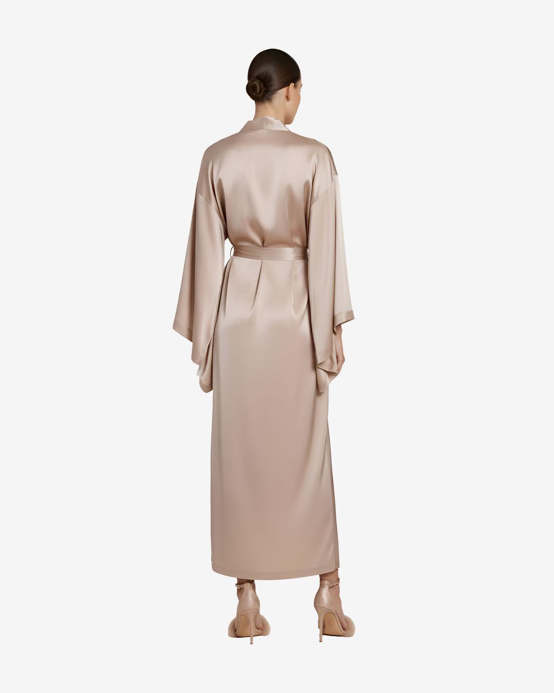 This is an opulent and fluid kimono or robe crafted from 100% silk in a soft, luminous blush pink or nude color. The silk fabric provides a smooth, exquisite drape and a subtle, beautiful sheen