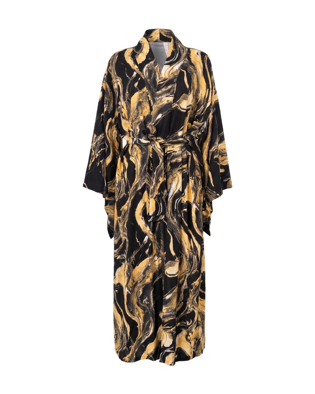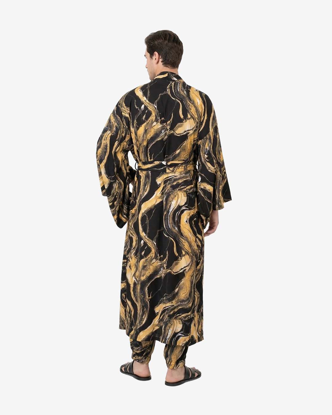 Comfortable unisex five-pocket kimono featuring functional sleeves that can be used as pockets, two standard pockets, and a hidden pocket in the placket designed to hold a fan. Recommended to be worn as a set with LILY A BLACK MARBLE pants, shorts, or skirts, allowing you to easily change your look depending on your mood and occasion, while being perfect for home wear, festivals or parties, summer days, and beach, pool, or boat time.