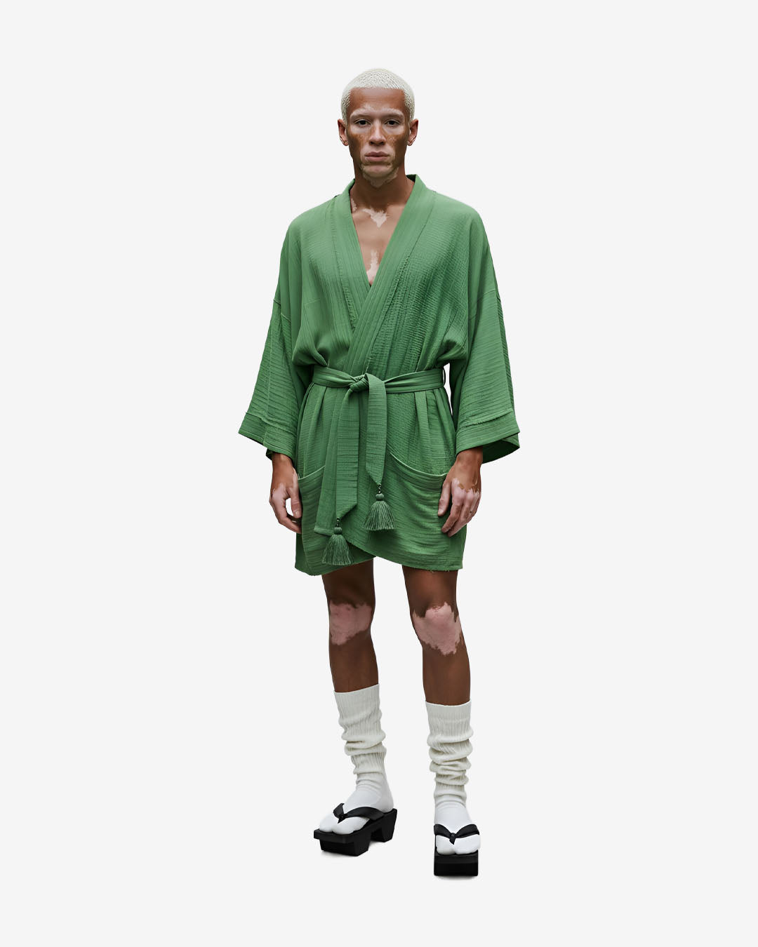 Designed for effortless layering, this kimono crafted from a breathable blend of 60 percent linen and 40 percent cotton offers a soft yet structured drape with a loose fit, mid length sleeves, front patch pockets, a detachable belt with playful tassels for versatile styling, and decorative stitching that adds artisanal detail, making it perfect for slow mornings, sunset strolls, or wearing over swimwear with ease and intention.