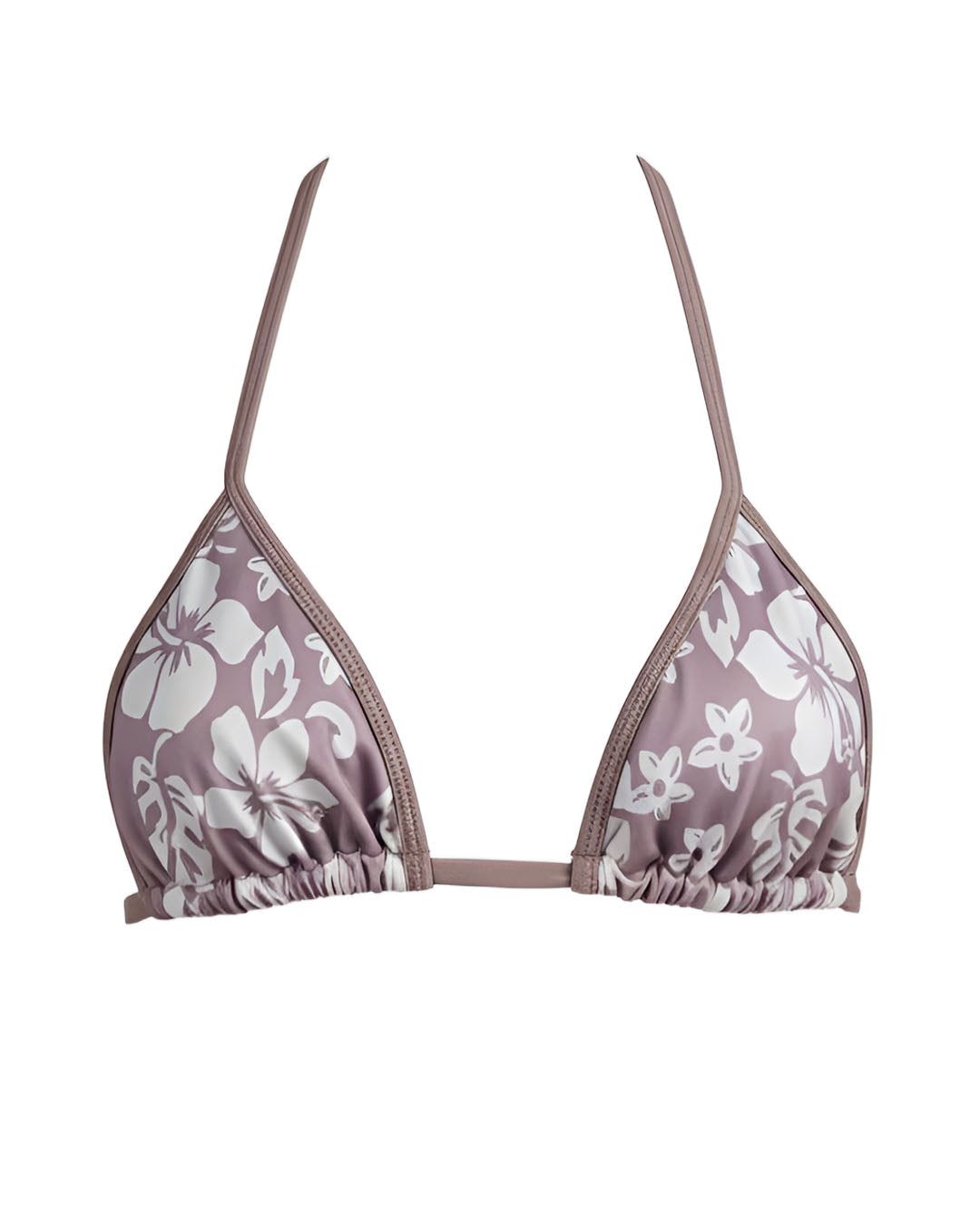 Reversible bikini featuring a plain brown side and a floral motif side — two bikinis in one.