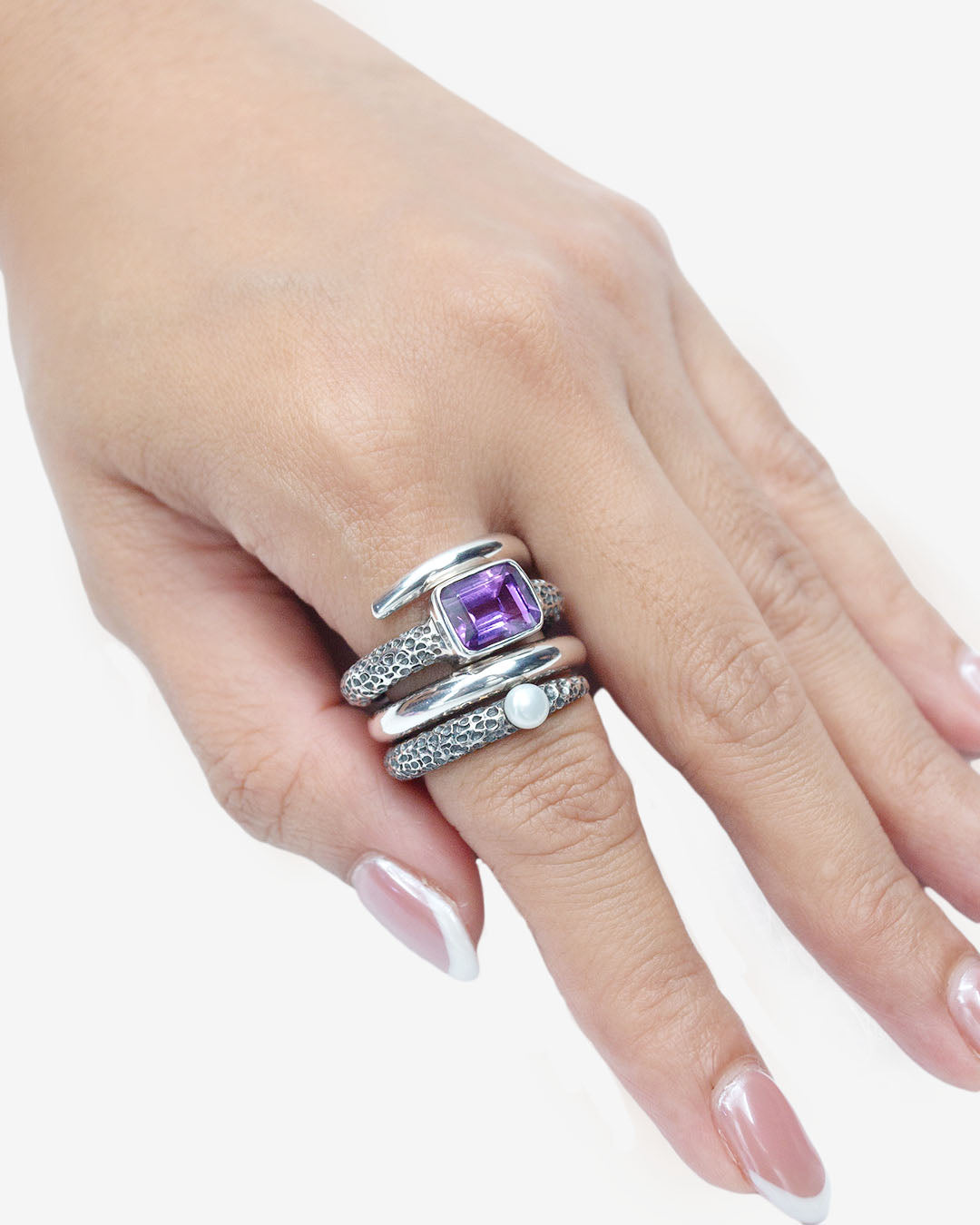 The most desirable ring of them all. A seductive and complex ring made of solid silver, the LUST Ring Amethyst is made combining a polished finish with a hammered, oxidized texture. It frames a white freshwater pearl and an amethyst stone.