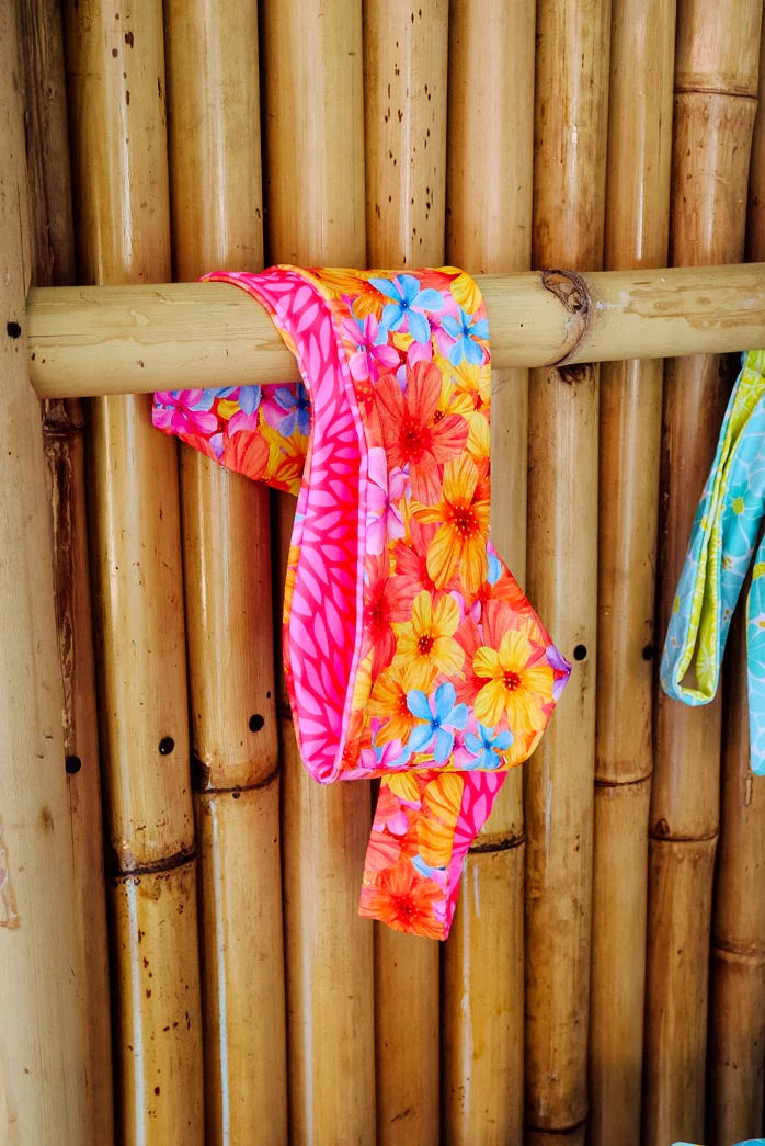 Ride the waves in style with the MAUI Reversible Surf Bikini Top! Whether you're hitting the surf or lounging by the shore, this top has got your back – literally. With a bold neon pink on one side and a vibrant orange floral print on the other, you get two stunning looks in one. Plus, it's designed to stay put, no matter how wild the waves get!