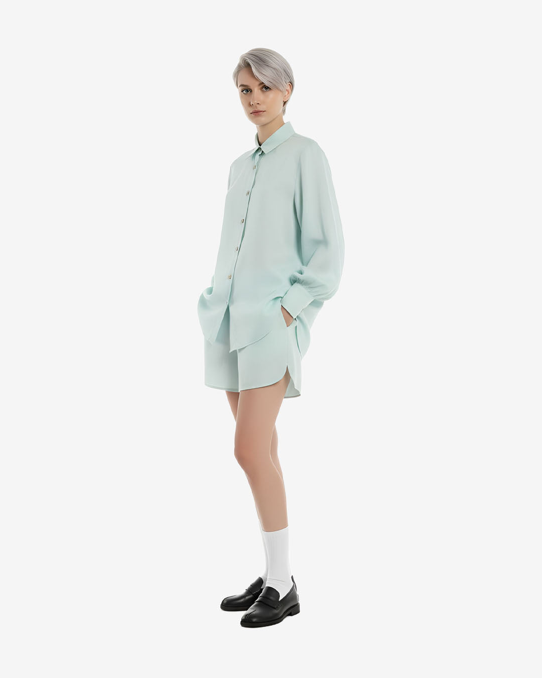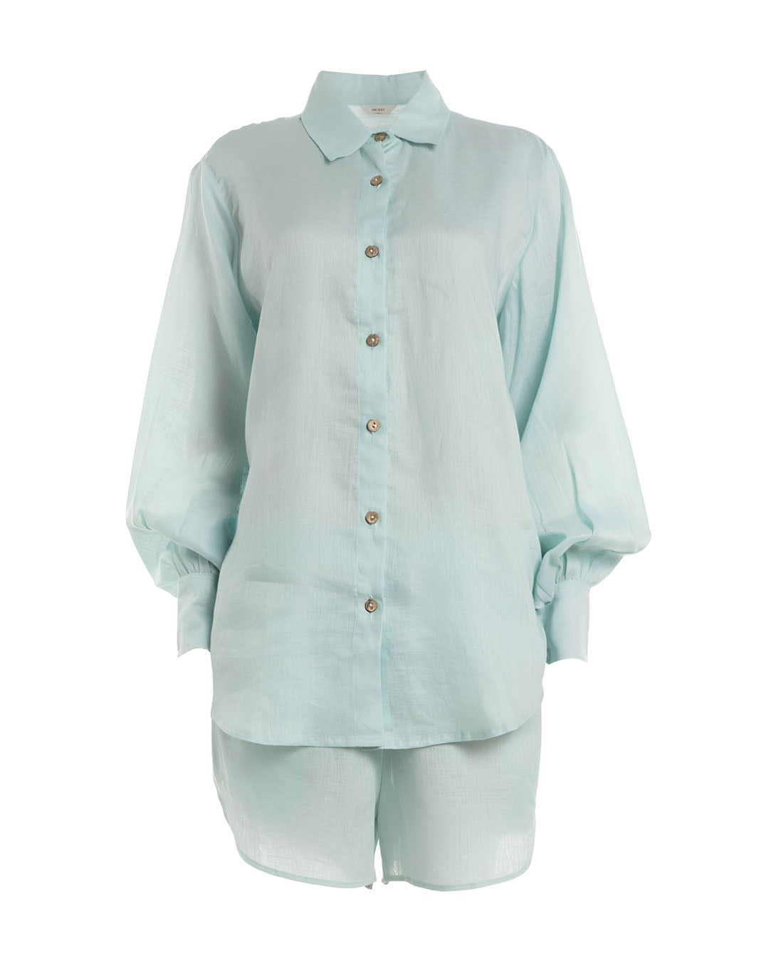Crafted from 100 percent breathable linen, this pajama set blends relaxed sophistication and natural charm with a loose classic collared shirt featuring coconut buttons and bishop sleeves, paired with high comfort shorts with an elastic waistband and side pockets for effortless comfort whether lounging at home or styling it for a breezy day out.