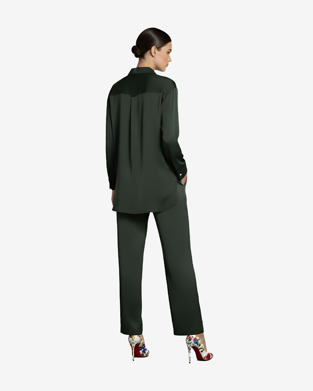 These are stunning, full-length trousers crafted from luxurious 100% silk fabric in green color. The silk gives the pants an incredibly fluid drape and a beautiful, subtle sheen that enhances their sophisticated look.