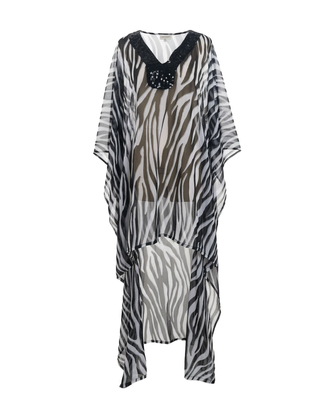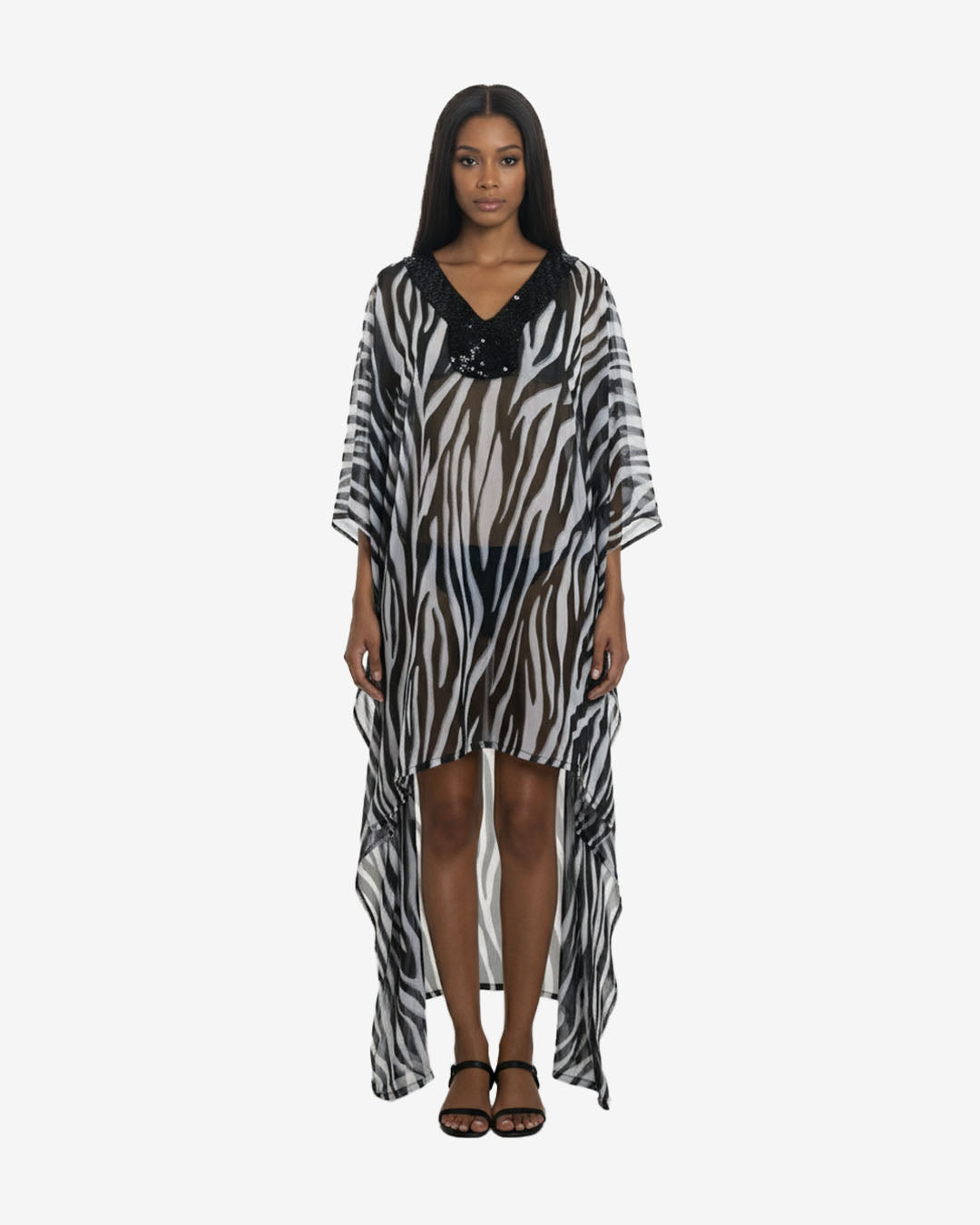 Parvati on size swimwear coverup with sequin beaded neck and flowy material texture giving the lux resort getaway feel