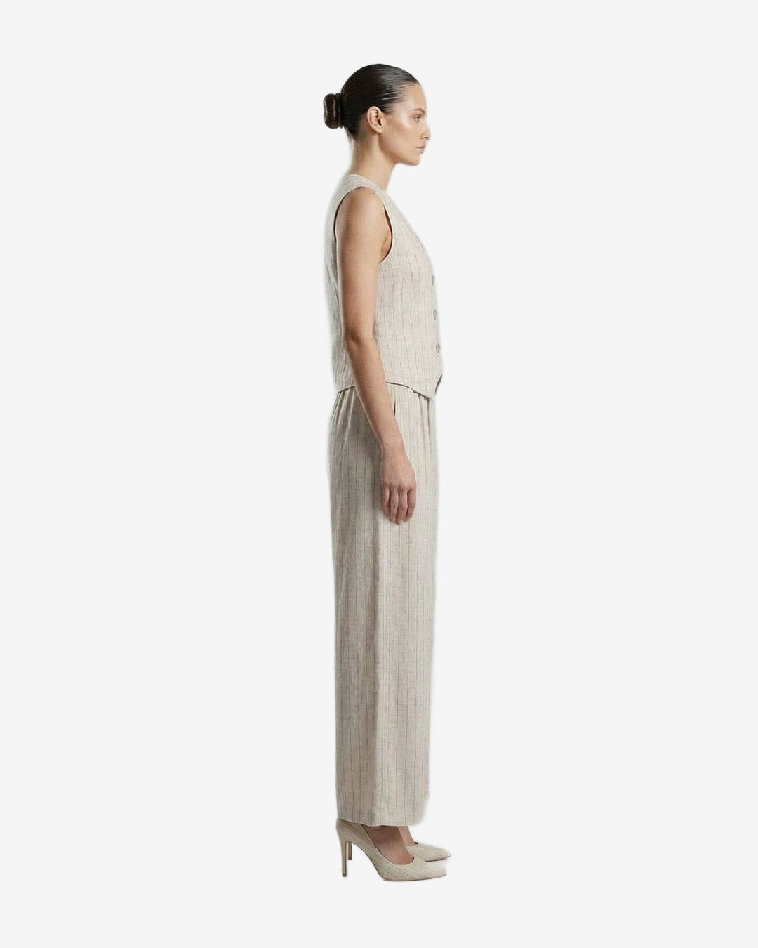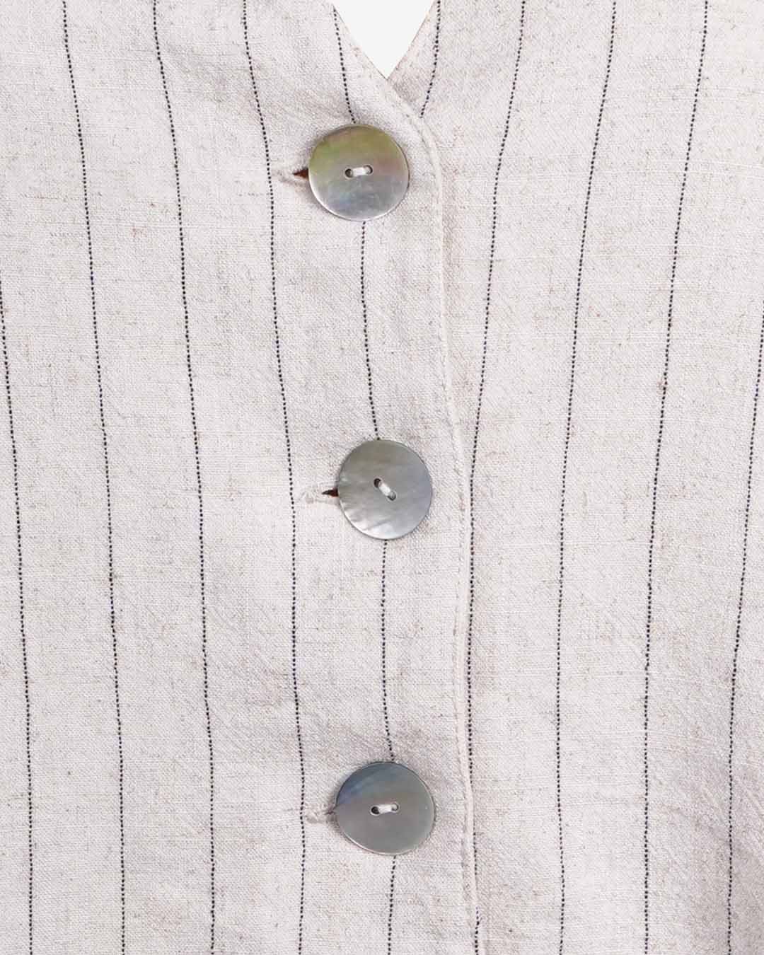 Petra Vest is a self fabric lined vest made in the luxe European Flax certified Linen Rayon pinstripe fabric. This classic fitted vest features large shell buttons and is made to be worn by itself or over our Cleo top and matched back to the Lauren Skirt or Greer Pants for a chic summer look.