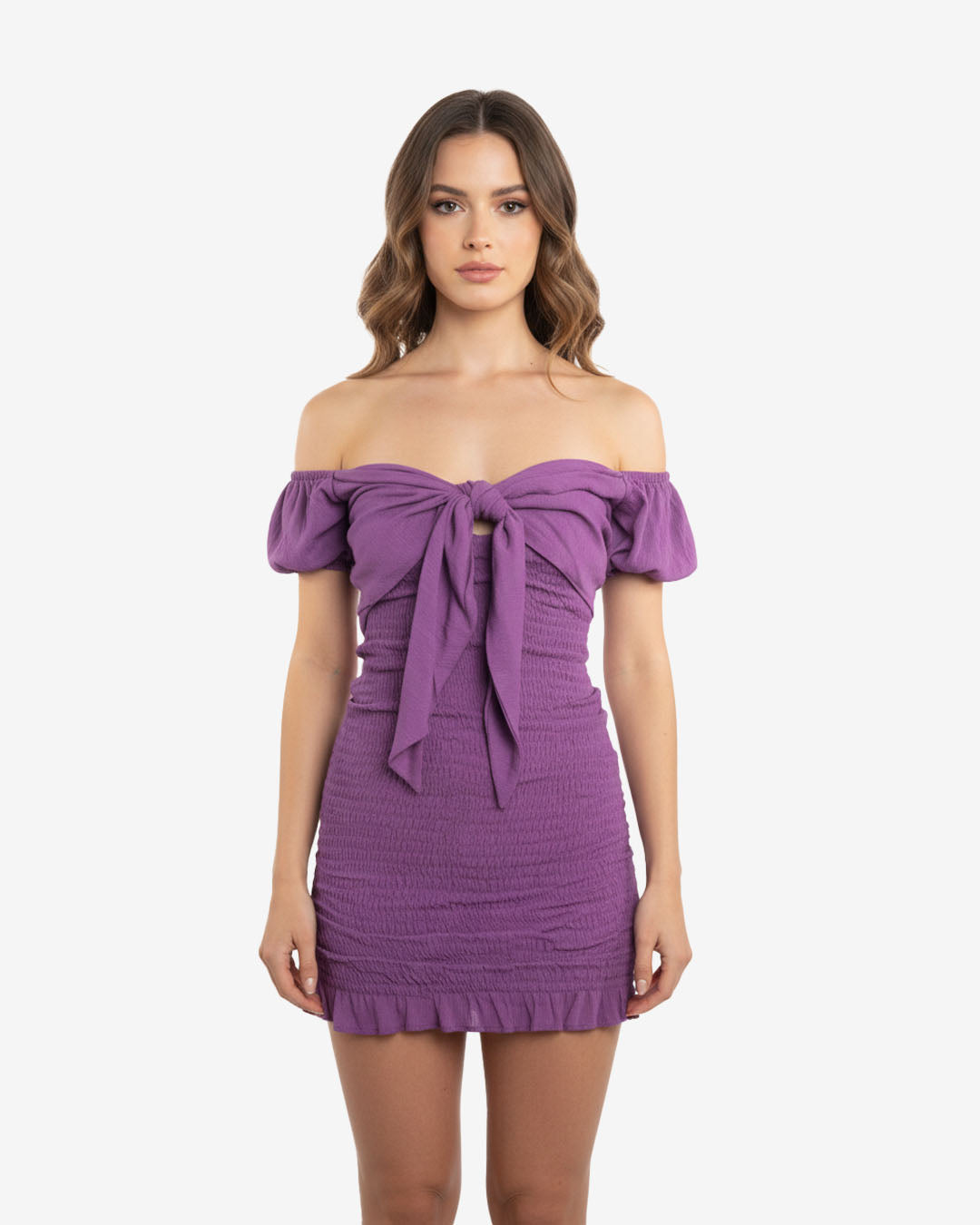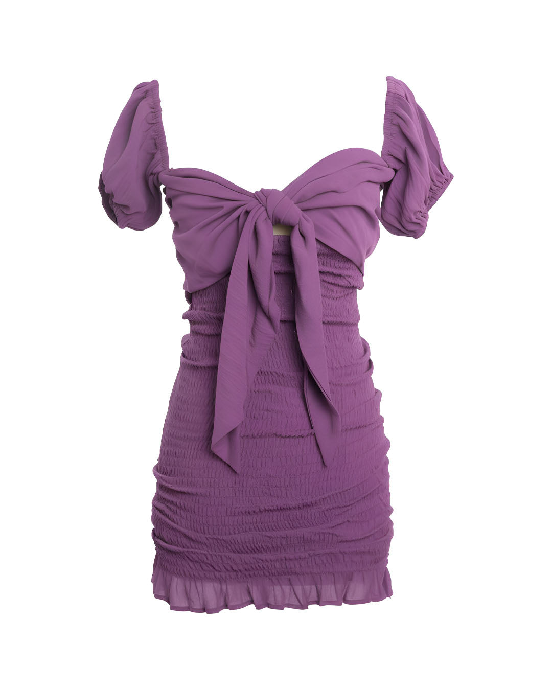 Off shoulder, front tie with puffy sleeves and body hugging gives all the 80s feel into the modern feel