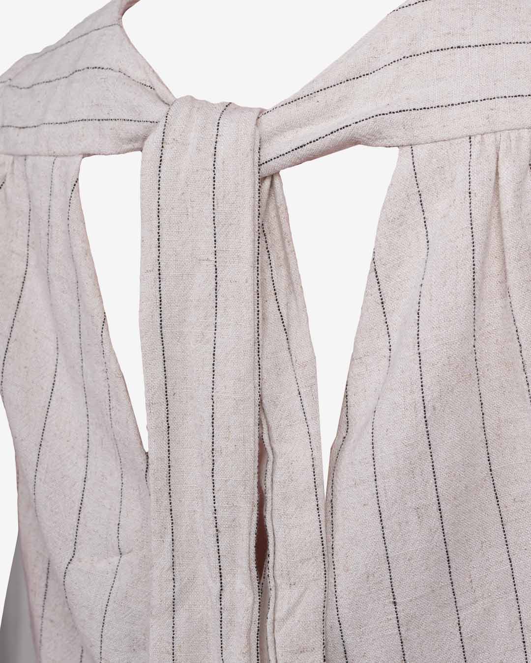 We have reworked out best selling Rylee Jumpsuit in this European Flax certified Linen Rayon pinstripe fabric. Rylee is designed with comfort and versatility in mind. Featuring a warm natural hue Rylee fs a full length jumpsuit with a wide leg, a cross front and front pockets, it is complete with an elastic waist, tie belt and an adjustable tie-up at the back to define your shape. Ready to take you from day to night, this unassuming piece will inject modern style into any look.