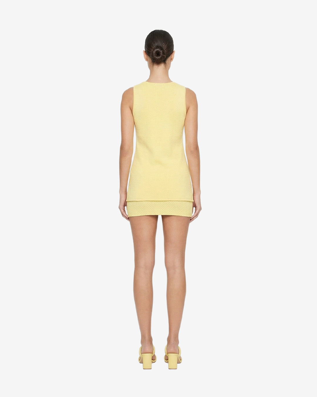 The Tala Mini Skirt in butter yellow, handmade in a delicate textured knit with a sculpted fit, is a warm-weather essential perfect for women’s skirt Bali, effortless women’s beachwear Bali, and chic women’s vacation outfits Bali.